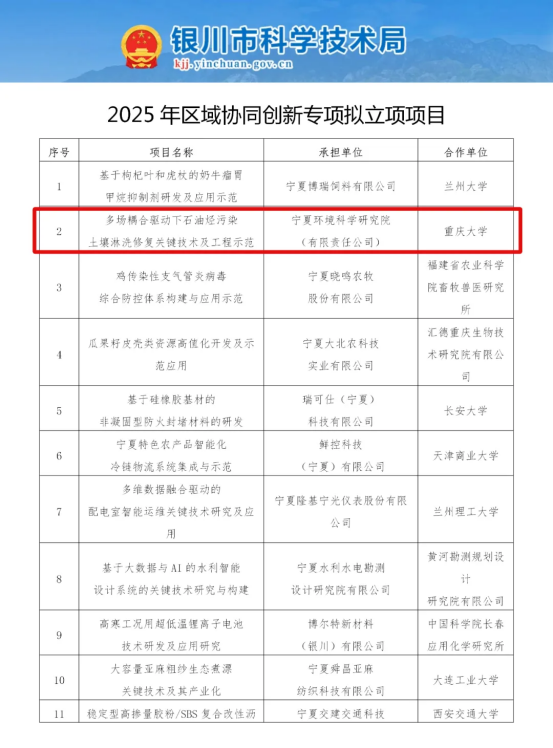 喜訊!近日,昆頂環(huán)保聯(lián)合寧夏環(huán)科院、中國(guó)石油天然氣股份有限公司長(zhǎng)慶油田分公司第三采油廠、重慶大學(xué)、寧夏大學(xué)申報(bào)的“多場(chǎng)耦合驅(qū)動(dòng)下石油烴污染土壤淋洗修復(fù)關(guān)鍵技術(shù)及工程示范”項(xiàng)目,成功入選2025年銀川市科技局首批科技計(jì)劃項(xiàng)目。