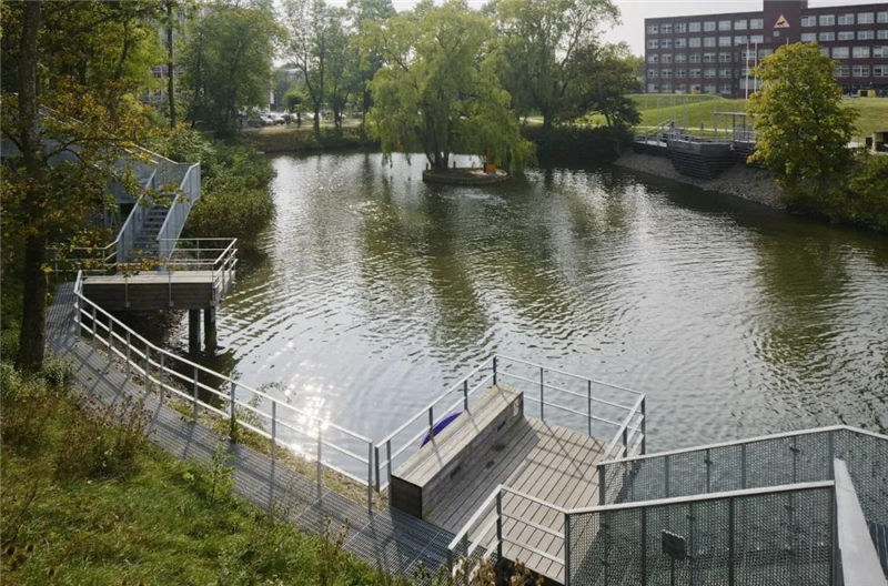 景觀(guān)設(shè)計(jì)的理念是讓人們以不同的方式去接近池塘陡峭的邊緣,這樣做的目的是在池塘周?chē)鷦?chuàng)造具有社會(huì)吸引力的場(chǎng)所和散步地。設(shè)計(jì)師建立了雙向設(shè)計(jì)原則,大池塘的西邊提供了可以駐足、坐下、觀(guān)景和約會(huì)的地方,這里的陽(yáng)光甲板和平臺(tái)位于水面之上,靠近邊緣。而東區(qū)則恰恰相反,那里有一條蜿蜒的長(zhǎng)廊,包含著一些較小的社交空間,沿著落差上下排布的樓梯在局部區(qū)域是一直延伸到水面的。