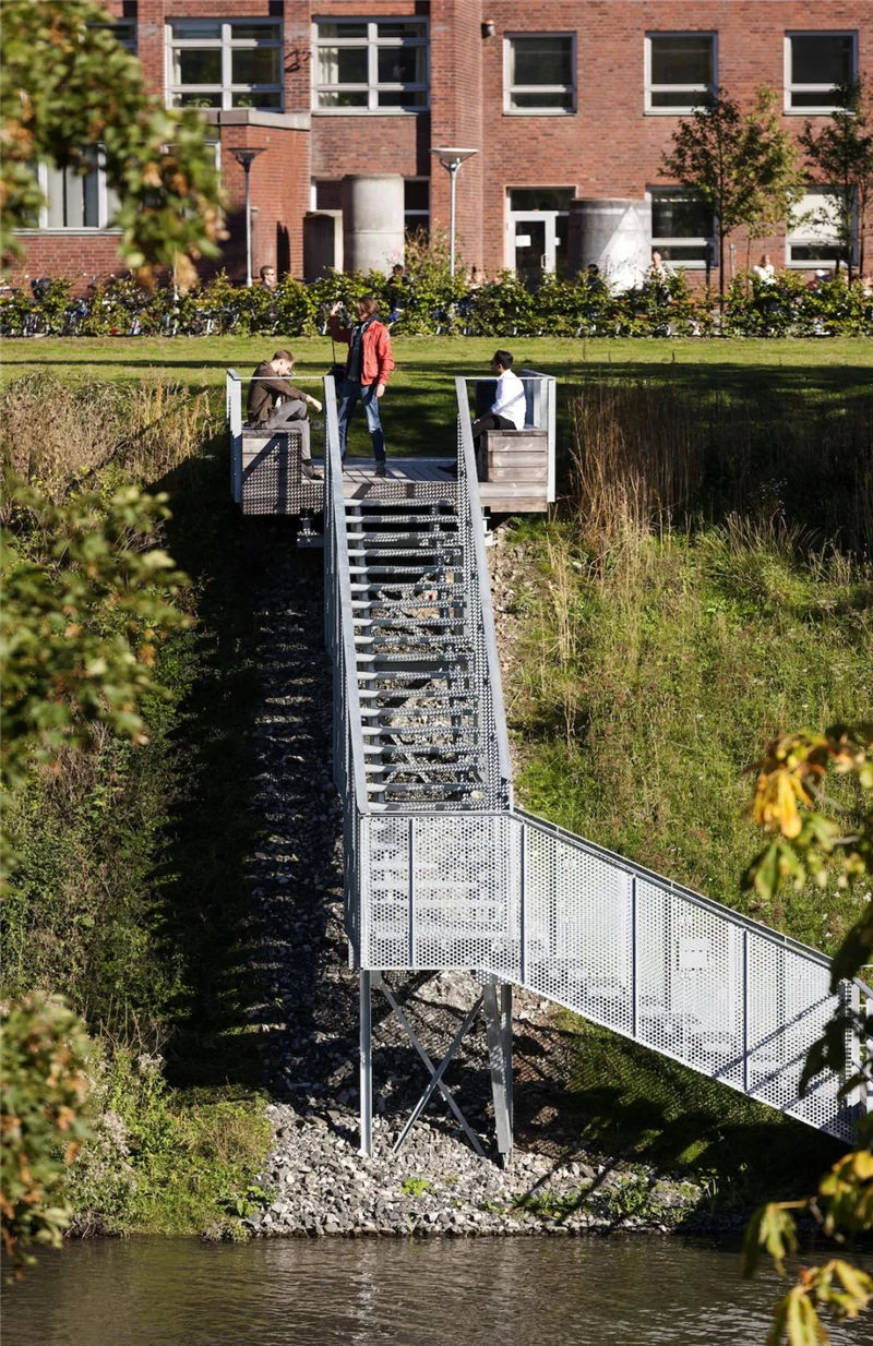因此,東邊和西邊的設(shè)計(jì)和所用的材料也有所不同,西邊的甲板選用的是木板。三個(gè)平臺(tái)分別被命名為休息室、涼亭和劇場(chǎng),這也是設(shè)計(jì)這三個(gè)場(chǎng)地時(shí)所依據(jù)的概念。東邊是一個(gè)由拉伸鋼板和樓梯組成的裝配平臺(tái),就像你在建筑工地上看到的那種類(lèi)型,這也反映了學(xué)校的一些授課內(nèi)容。東側(cè)是平緩的,幾乎漂浮在水面上,設(shè)計(jì)師在此精心安排了一條有趣的散步長(zhǎng)廊;西側(cè)堅(jiān)固、穩(wěn)定、重力高,形成了休息和社交的場(chǎng)所。