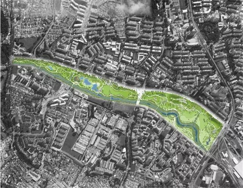 該方案在一個(gè)泛濫平原理念的基礎(chǔ)上設(shè)計(jì),當(dāng)水位低時(shí),人們能夠在寬闊的河岸沿線(xiàn)親近水、享受休閑活動(dòng),而在暴雨時(shí)期,河流附近的公園綠地成為一條運(yùn)輸線(xiàn)路,運(yùn)送下游的水流,在公園內(nèi)進(jìn)行多種土地利用,為公共活動(dòng)建造出更多的空間。