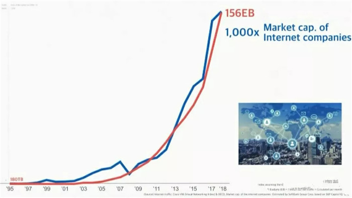 這是全球網(wǎng)絡(luò)的流量,橫坐標是年份。紅色的線代表流量。從最早的1995年到2018年,網(wǎng)絡(luò)的流量,增加了100萬倍。我們再來看另一條藍色的線。藍色的線,表現(xiàn)的是23年來全球互聯(lián)網(wǎng)公司的市場價值(市值)。